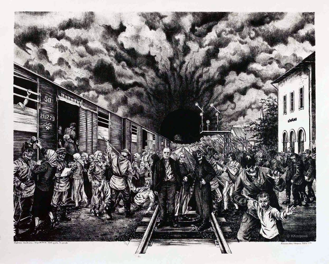 Aleksandrs also participated in demonstrations and provided his art to newspapers exposing Soviet atrocities, risking his life to support the effort of Latvians to free themselves from the occupiers. He was twice beat up and hospitalized with a concussion. Attackers were, as he called them, the “red fascists.” One month before his death, he sent a letter to his brother, Konstantins, jokingly suggesting he may have to leave town as local Russians in Rēzekne had been beating on his door at night with death threats following a local showing of his artwork. His letter became serious when he described his wish to be buried with a Latvian flag over his coffin. On March 22, 1994, Aleksandrs’ body was found in the corridor next to his room. The circumstances surrounding his death remain a mystery, though officially are due to natural causes. Days later his room was found ransacked, with documents and papers strewn all over the floor. Hidden under his bed attached to the springs was the plate of his final lithograph (“Mūsu Rīga”/“Our Rīga”). Also found was the deed to his grandfather's, Justyns Volonts, farm and forest; and Justyn's passport, which was used for his family to obtain citizenship and ownership of the property. This land had earned Justyns, his wife Stefānija, and daughter Regina one-way ‘tickets’ in cattle cars to Siberia during the first mass deportation of 15,424 Latvians (8,259 men and 7,165 women) on June 14, 1941 (State Archives of Latvia 2001). Aleksandrs Karpovs, a Latvian patriot, was buried with a Latvian flag draped over his coffin. Today, his remaining brother, Konstantins, and Aleksandrs' nieces and nephews, are the proud advocates of Latvian culture and history.